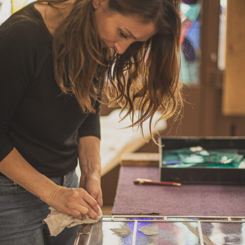 Titulaire d’un BMA Arts et techniques du verre et exerçant dans le vitrail depuis 2000, Angéline Clermont mène aussi bien des chantiers de création contemporaine que des restaurations de vitraux anciens pour des commandes publiques ou privées.
