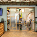 Dans l’exemple ci dessous le vitrail sert de cloison translucide à la cuisine. La verrière dessiné par l’atelier de vitrail Montpellier et réalisé par un ferronnier permet d’allier métal et verre et bien sûr soutient les panneaux de vitraux.